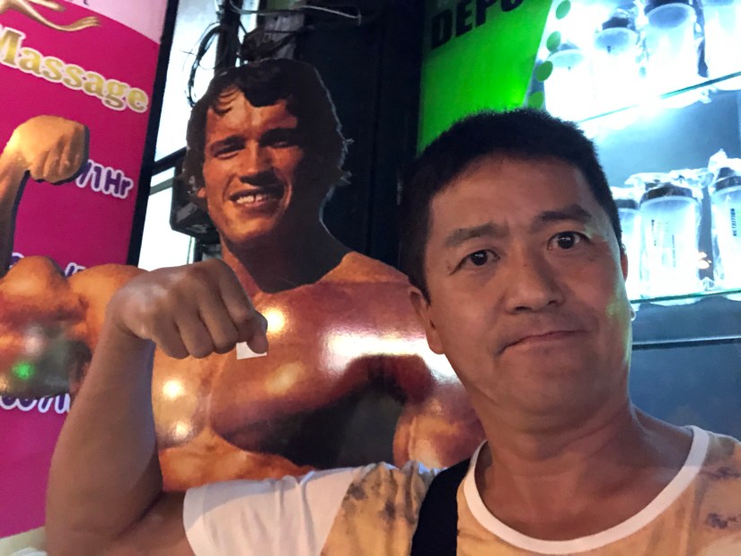 さっぱりして歩いているとアーノルドと出会い2ショット