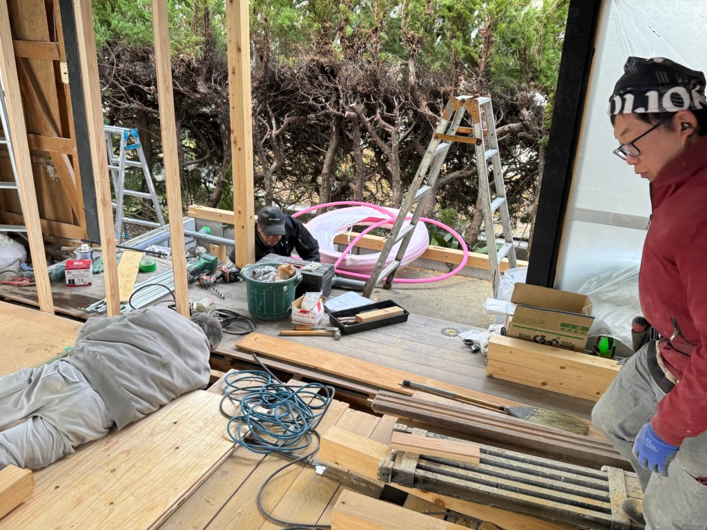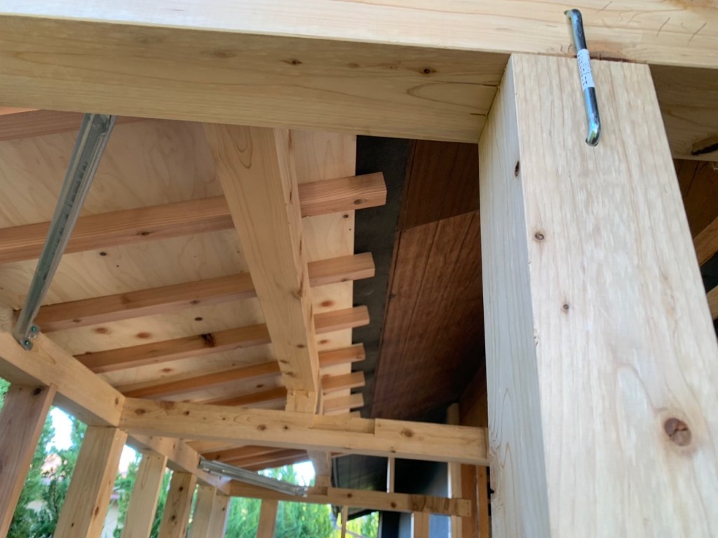 きれいな仕上がりを見届けて、本丸の現場へ。今日のミッション.1床柱建て。この家は、平家だが、中に大黒柱がない。強度にやや不安があったので、デザインも映える床柱を2本、オブジェと家の補強を兼ねて入れる事にした。