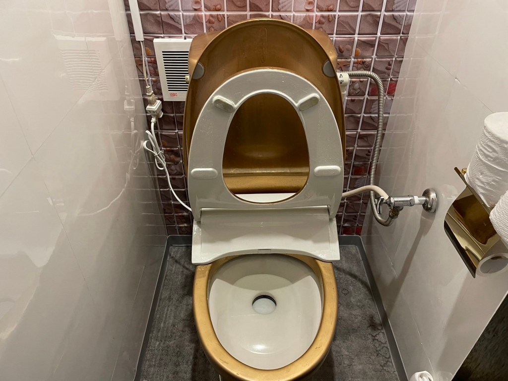 中2日の現場、朝一は、M丸くんが、アソビバーのゴールドTの塗装をやり直してくれてるのを確認。この便器座ると金運が上がるらしい。