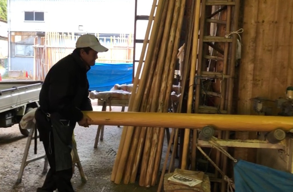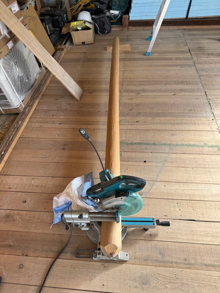 家の寸法に合わせて、大黒柱になるようにギリギリでカットして叩き込む。
