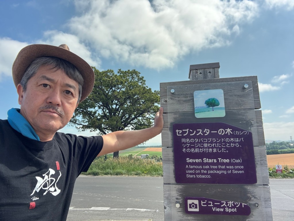 畑の色が折り重なりパッチワークのような風景が名前の由来のようだ。セブンスターの木と名付けられた木は、セブンスターの箱にその風景写真が使われたことが由来。