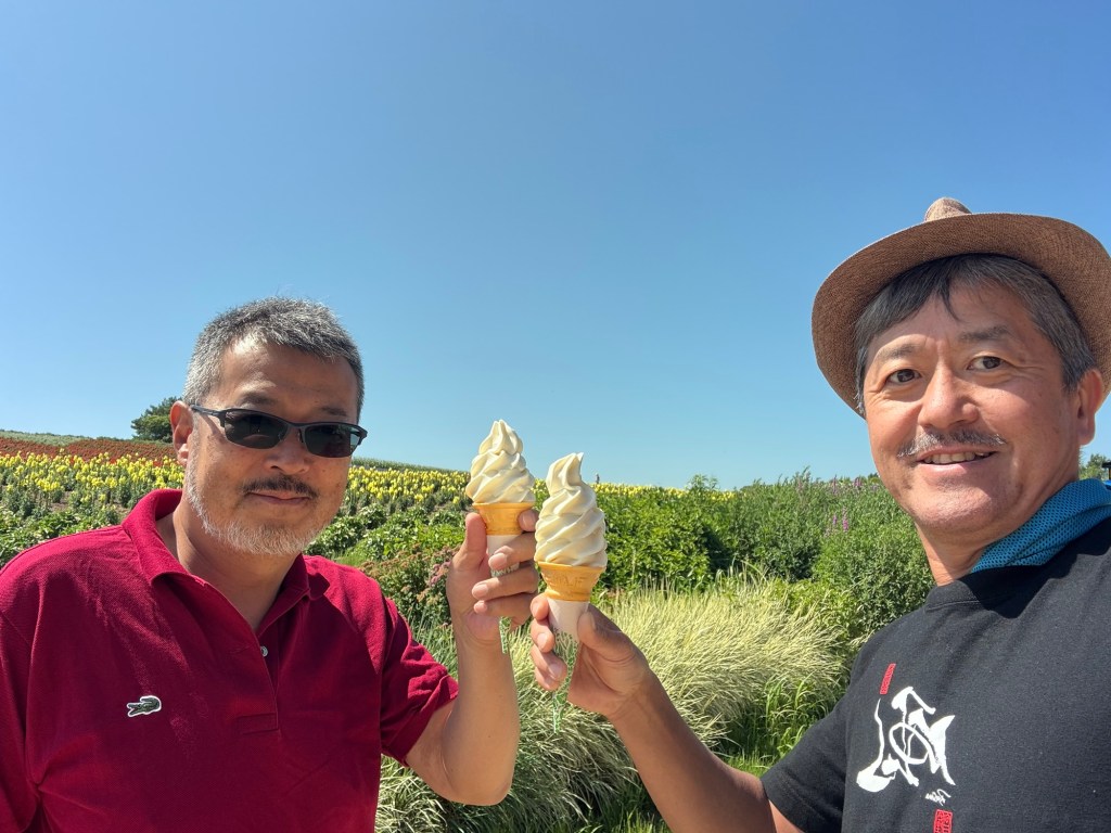 途中、ソフトクリームで乾杯したり、ちょくちょく現れるヒクマを倒したり、仲良くなったりで、今日の目玉である北星山ラベンダー園での花火大会までの時間を潰す。