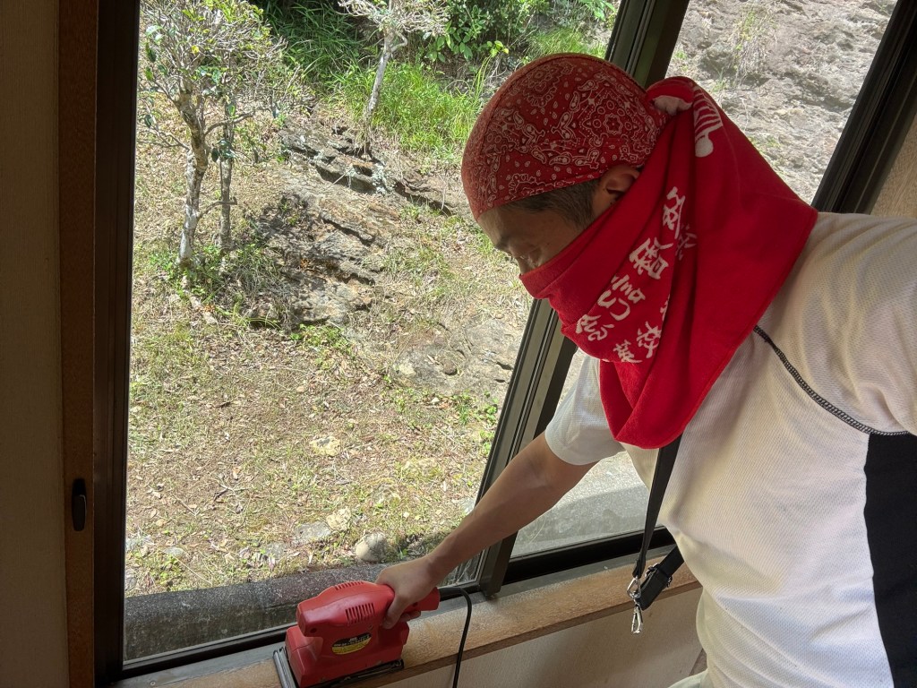今日は、クロス職人がクロス剥がしをしている横で、私はひたすら窓枠のサンダーがけをやっていた。