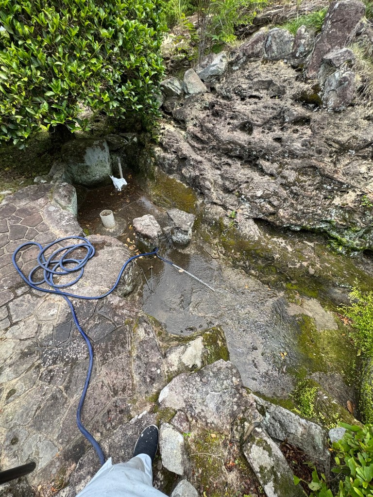 合間に池の再生を試みている。亀裂が多いが、果たして水は、溜まるだろうか?