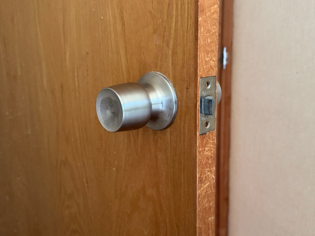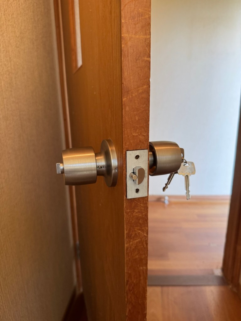 お次は、取手の交換、2軒の家は渡り廊下で繋がっているので、通路の扉にカギを付けてコネクトする。1軒15名で、全体で30名の宿泊を可能にする。学生のスポーツ合宿などに是非使っていただきたい。