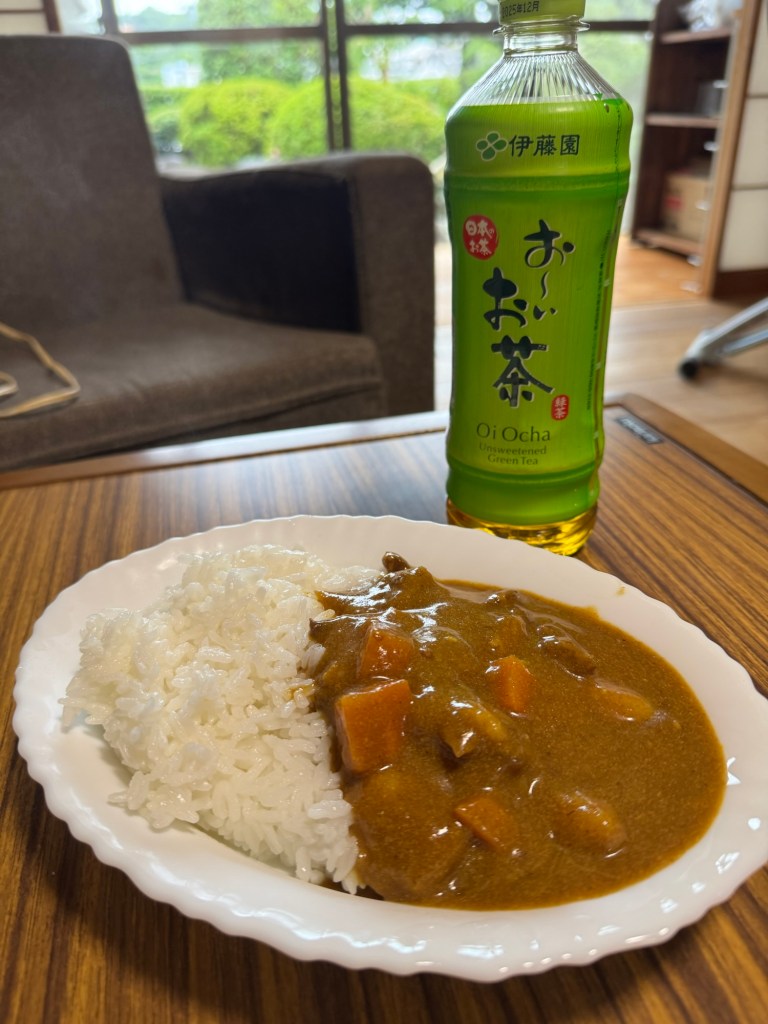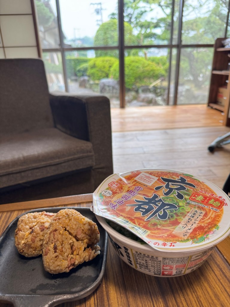 現場では、昼メシを食べに出る時間ロスがもったいないので、カップ麺と飯類のワンパターン。美しい庭を眺めながらあれこれ思考するのが楽しい。