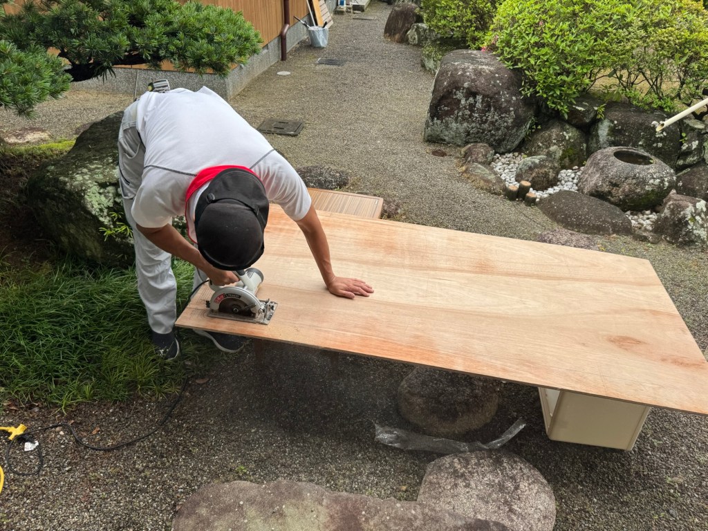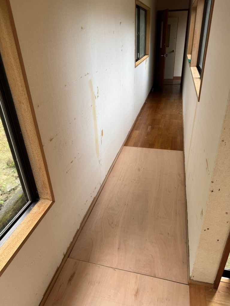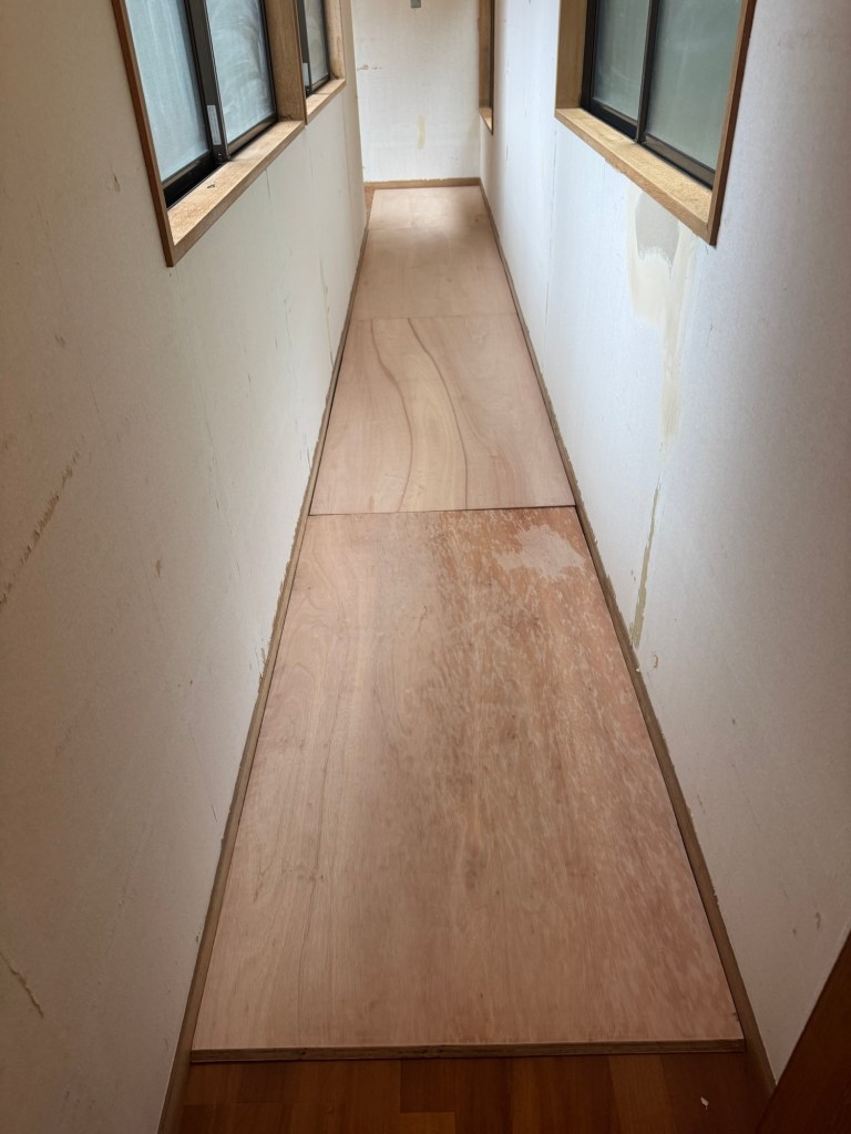 渡り廊下の床がだいぶ痛んでいるようで歩くとフカフカしているところにコンパネを貼って強化してCFを貼るという作業だ。今回は、CF貼りは、職人に任せて僕は、コンパネを貼る作業。