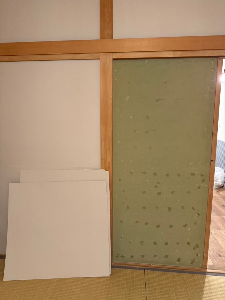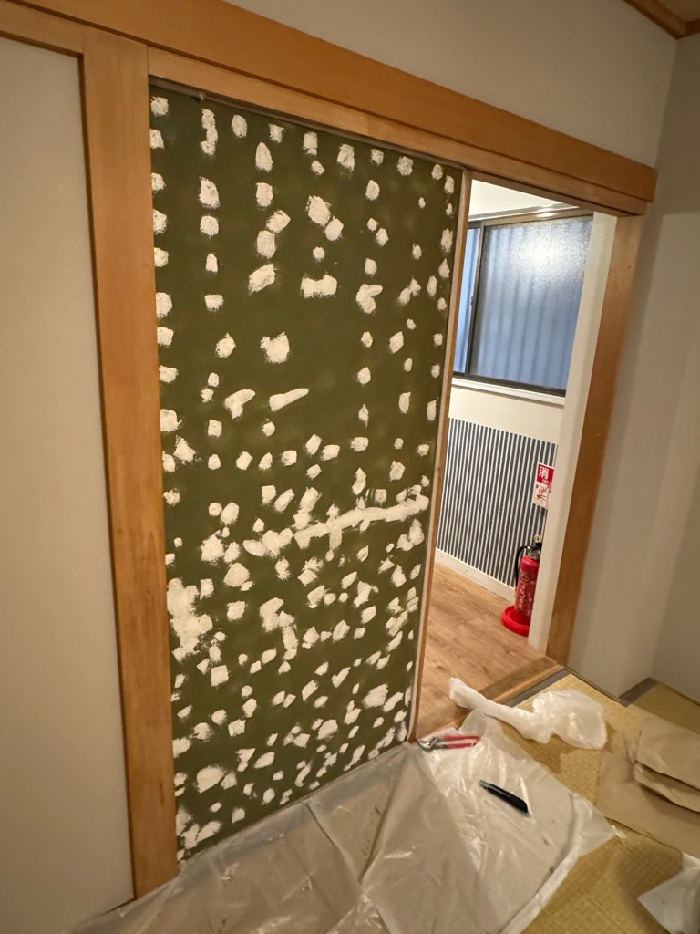 先ずは、残ったタッカーのシンをぬいて、ボンドでの剥がれやタッカーの穴埋めをパテで行う。