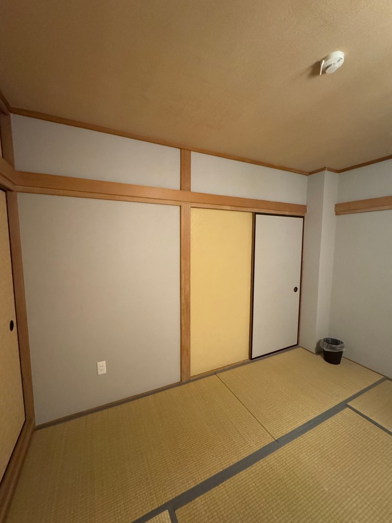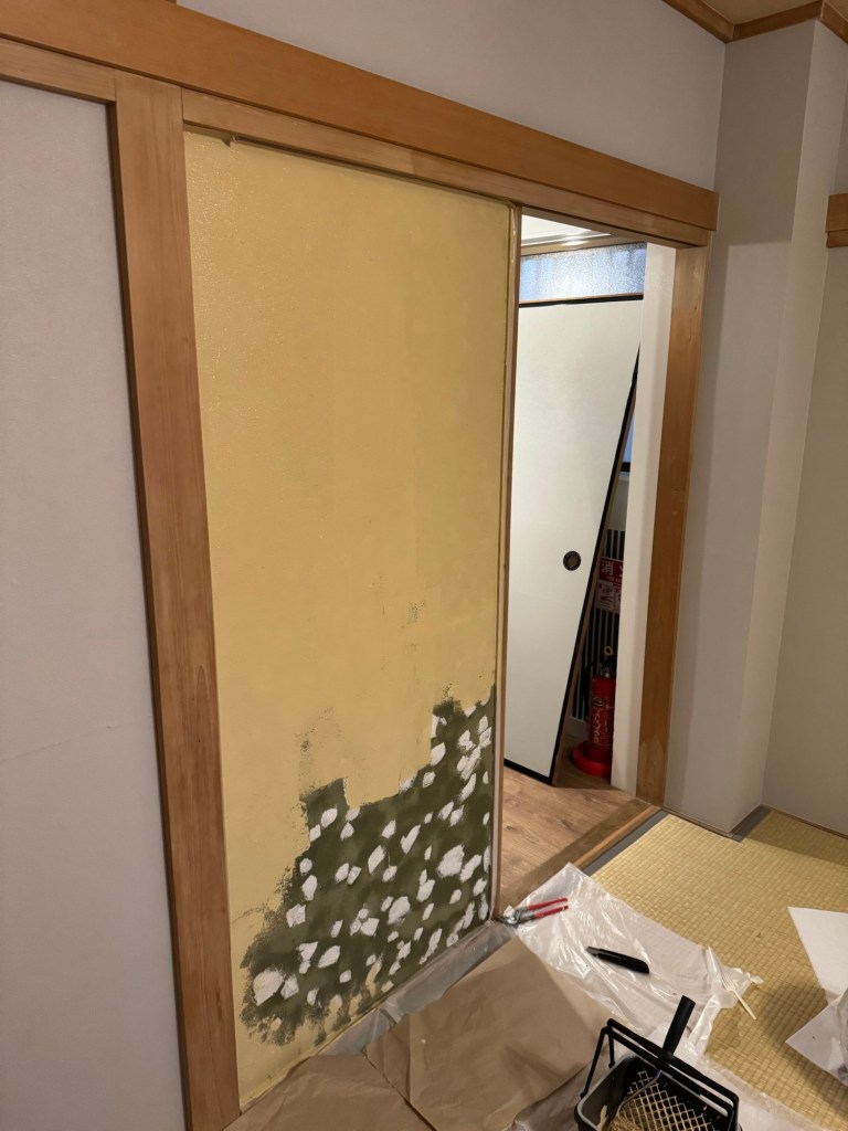 最初は、ゲストにやられたのかと思ったが和室の土壁にボンドとタッカーでベニア板を貼り付けクロス仕上げしただけだったので、木が反ってきて剥がれたようだ。あまりよい施工ではい。