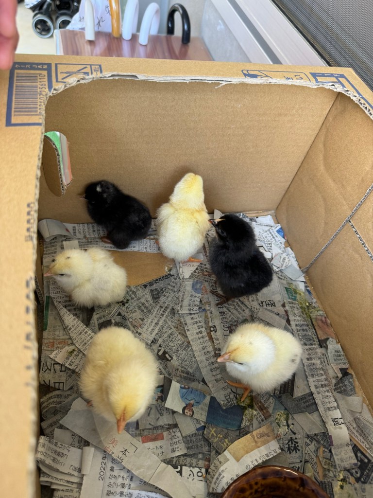 今年も友人が経営する保育園からのオファーで有精卵と孵化機を渡して10個の卵のうち7個が孵った。