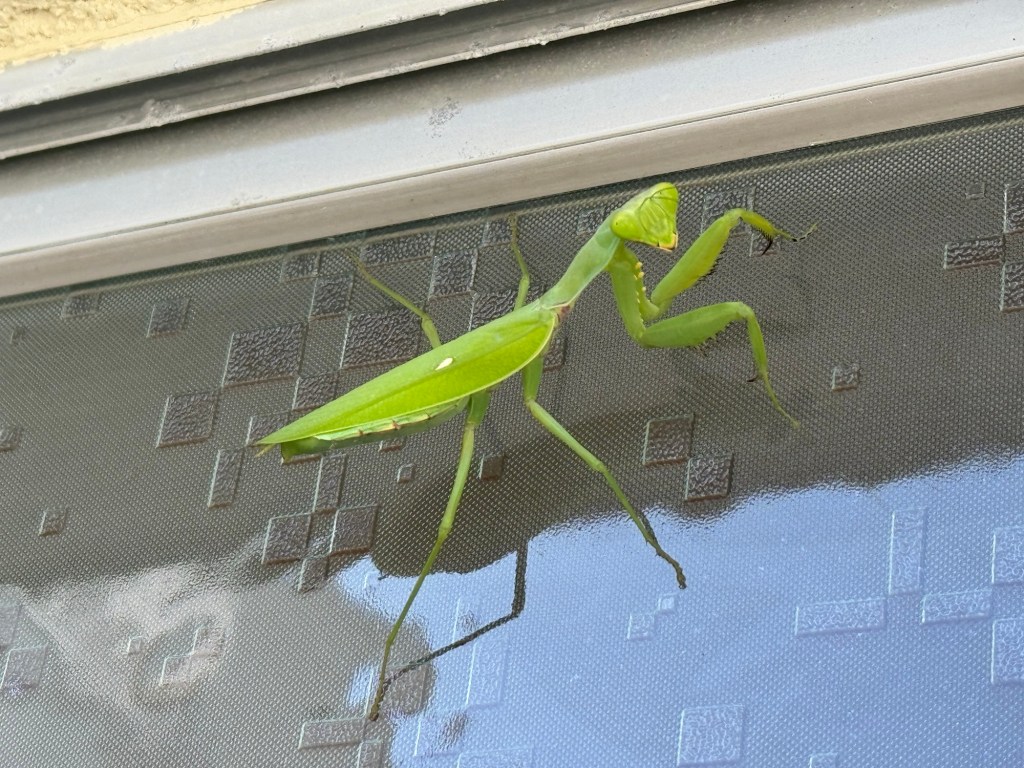 カマキリも立派になって窓にへばりついていた。