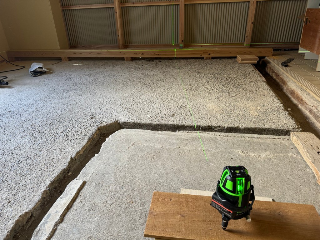 材木のサイズは、決まってるので、切ったりはつったりの手間を最小限にするための図面づくりは、重要になる。ここで役立つのがAmazonで買ったレーザー墨出し器、初めて使うが、やはりかなり便利であり仕事の効率化ができるスグレモノだ!