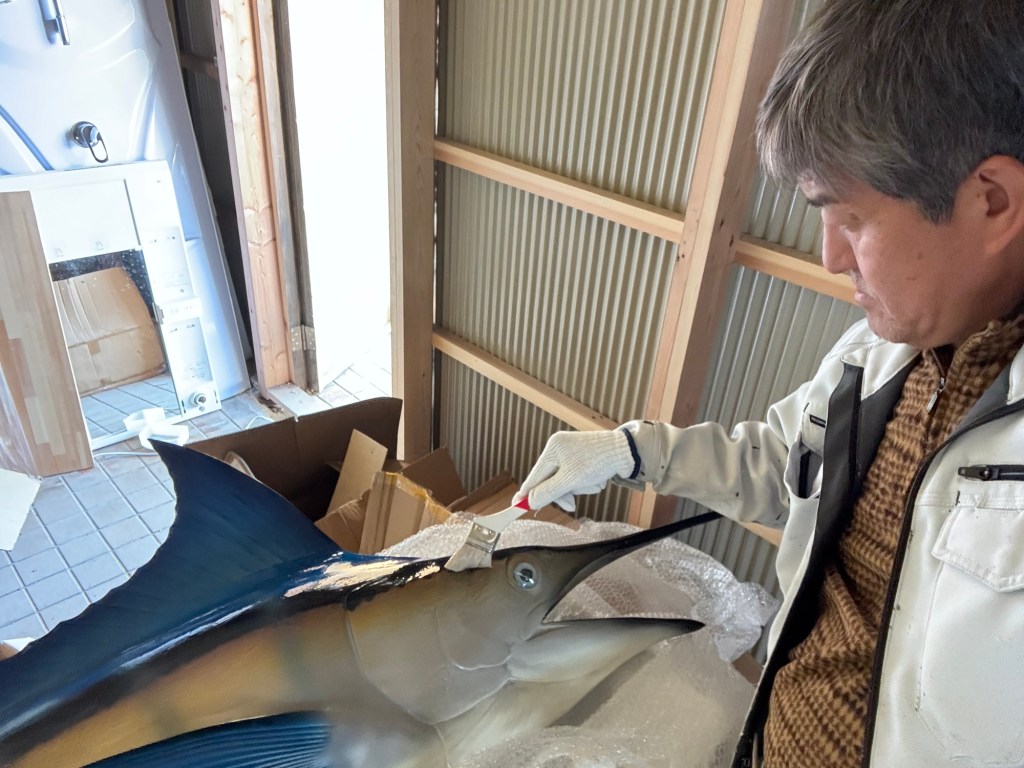 看板になるオブジェのカジキマグロくんの紫外線対策のために日焼け止めのお化粧直しもしてあげた。