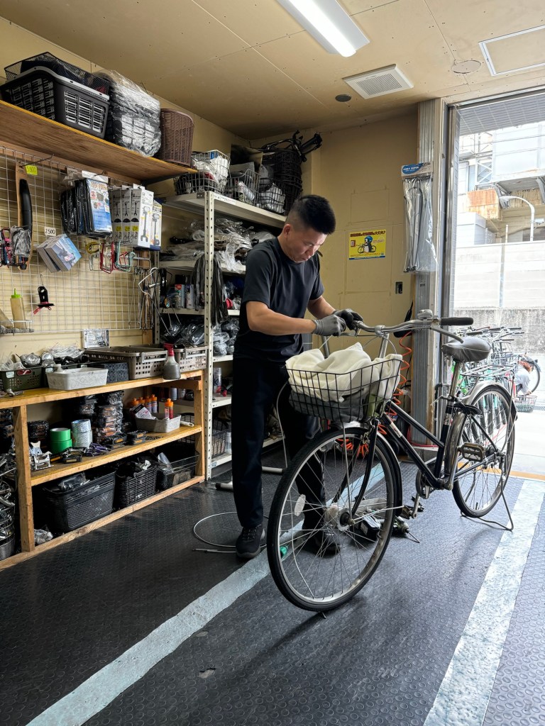 途中くたびれた自転車屋1件目のおじいちゃんは、これは修理不可とあっさり、2件目のくたびれた自転車屋のおっさんは、これは、ワイヤー在庫がないからできない。と、半分あきらめモードで3件目、立派に自転車がずらりと並ぶ自転車屋、ベトナム人の若者が、「これは3000円で直します」と即答。