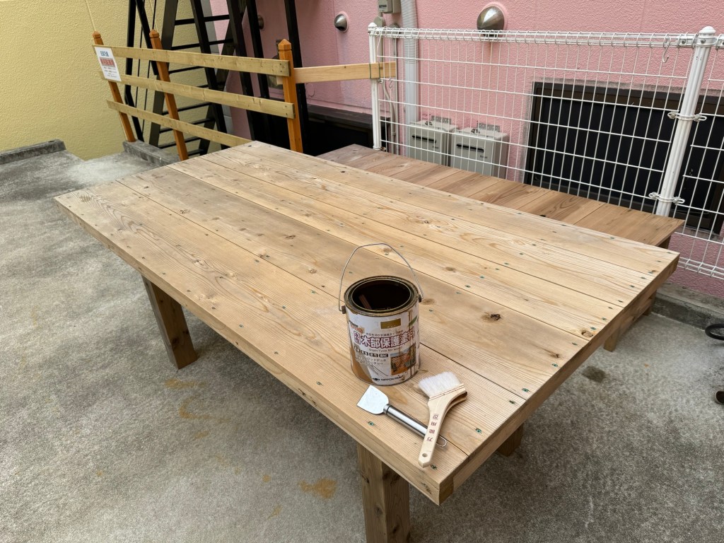 快晴の暖かい日差しに誘われて、BBQテラスの手作りテーブルの塗装をやる気になる。ここは、雨ざらしなんで、柵との色合わせも兼ねて防虫防腐塗料を塗って、長持ちするようにした。
