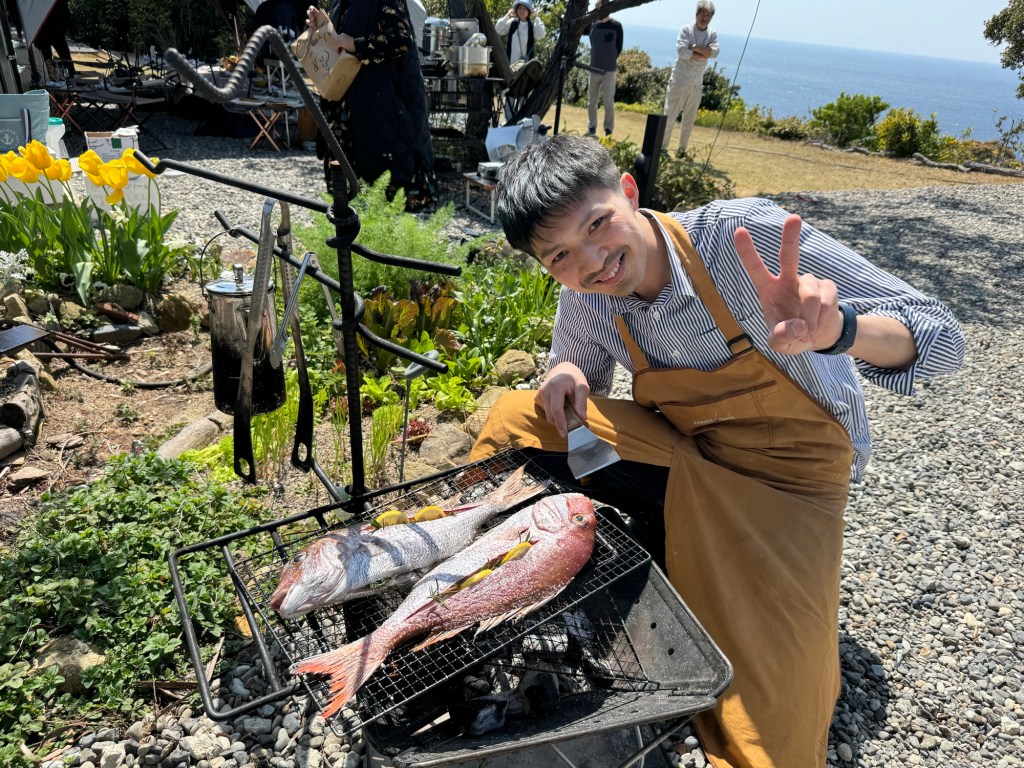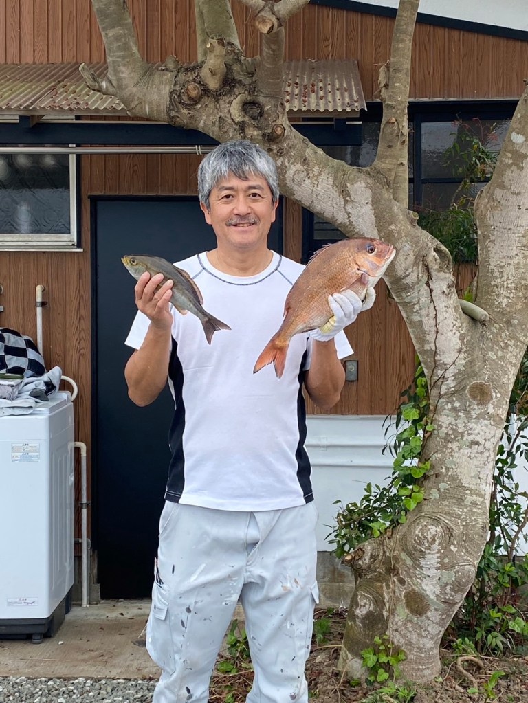 そうかと思うとお次は、反対側のお隣さんのご主人が砕石を懸命に広げている僕に「魚たべる?」と声をかけてきた。「ハイ食べます!」と駆けつけると近くの富田浜で釣ってきた鯛とイサギをだしてくれた。