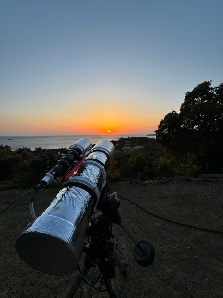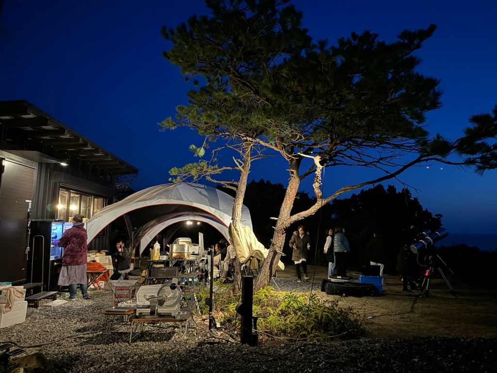 今日は、すさみグランピングパーティーに招かれた。天体博士が来ていてすごい望遠鏡を持参で色をそえる。