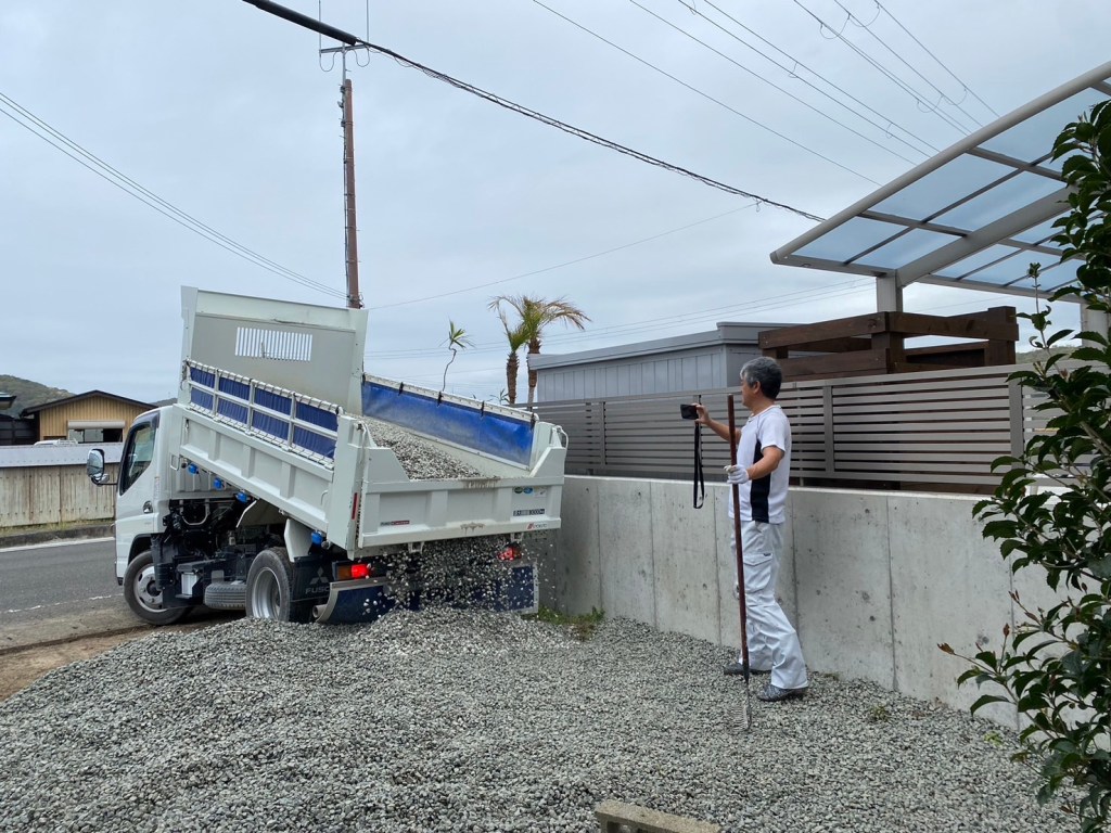 いつも車を停めさせてくれるお隣さんのガレージの砕石が減っていたので、プレゼントした。お礼にと庭の草抜きを手伝ってくれた。