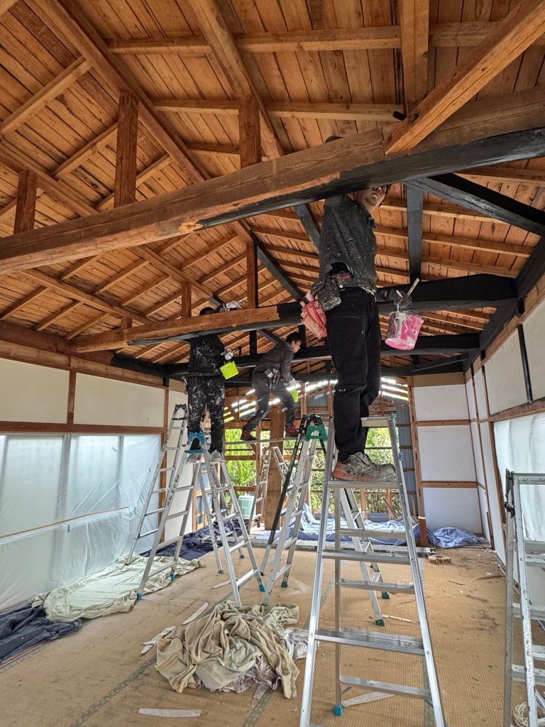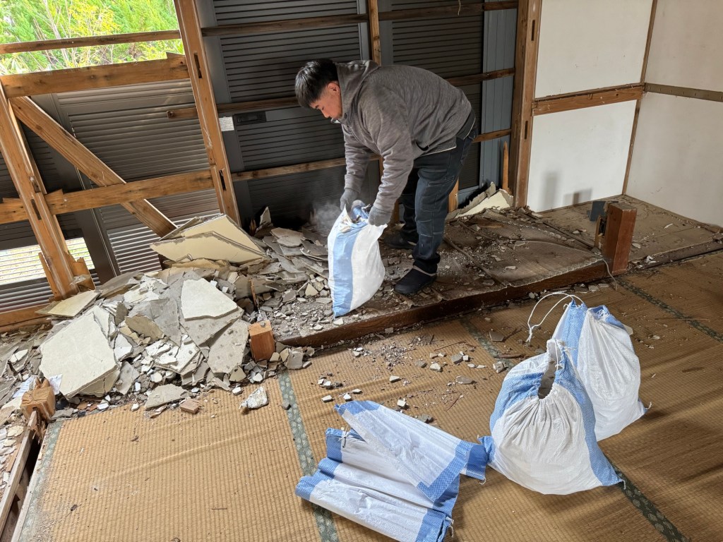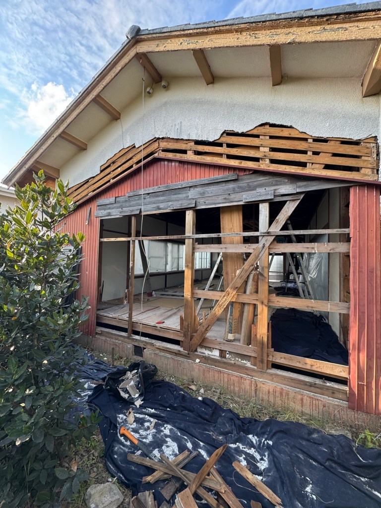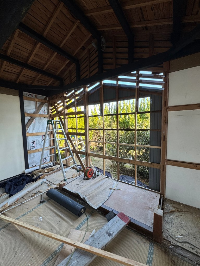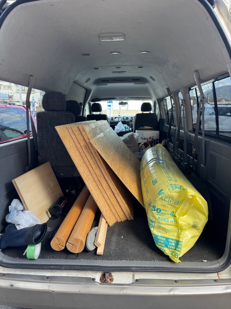 昼からは風穴を埋めるための木工事、なんとか壁を貼れるとこまで修復した。材料は、現場にあった棚を解体して再利用、自分でやるからこそできるリサイクル。