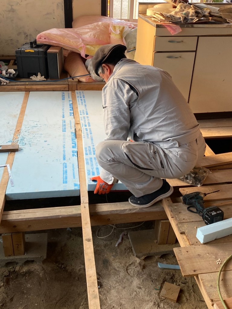 私は、壁の補修を仕上げて、いよいよ初体験の床の断熱材工事。YouTubeでしっかり研究して、イメージは、出来上がっていたが、45ミリの隙間に、50ミリの断熱材を買ったため、5ミリの壁と格闘。フラットにするために、ところどころを5ミリを削らないと収まらないのだ。わかってはいたものの、これが意外と時間を食う作業に。夕方まで頑張ったが、4枚しか出来なかった。