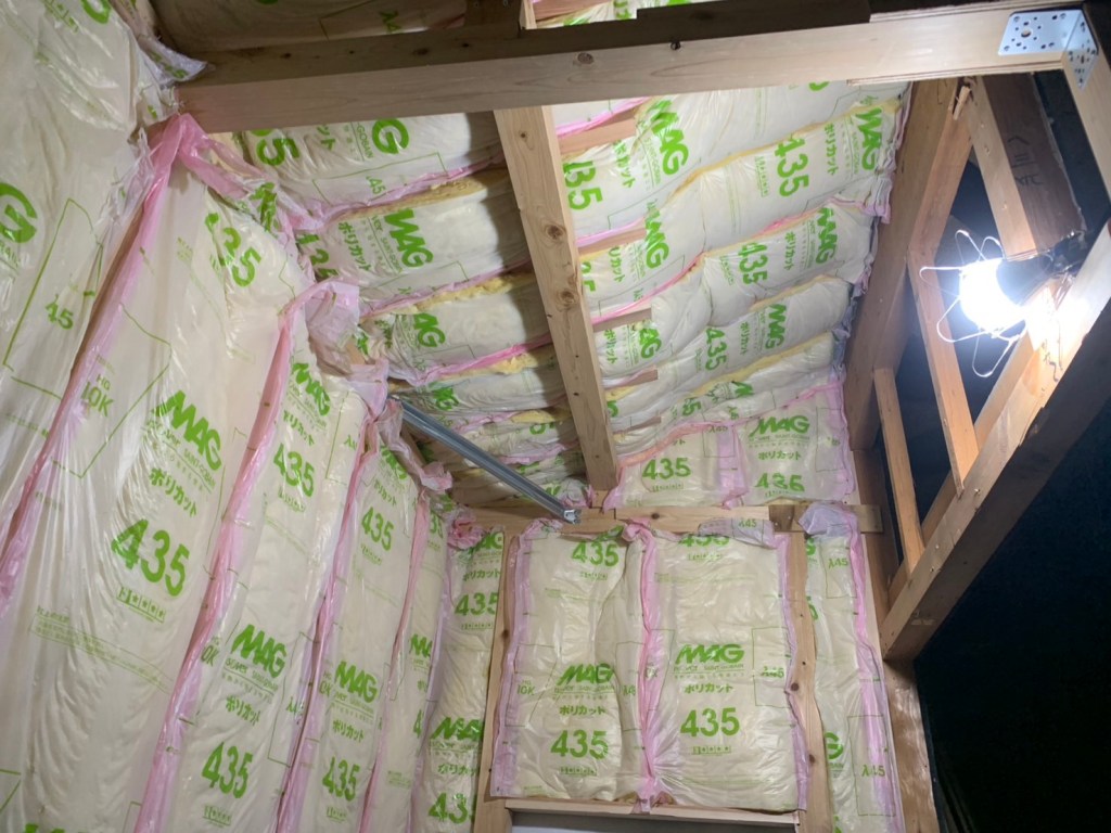 1日がかりで、部屋の約半分は、完成させた。初床断熱材作業にしては、イメージ通りで満足じゃ。