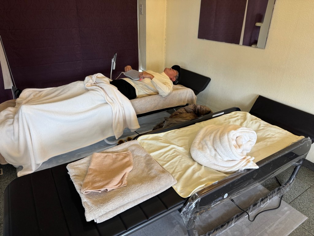 横になるだけで、機械が背筋の悪いところを見つけて指圧、お灸を行ってくれる。商売の不振で首が回らなくなったY氏もこのベッドで首が回るようになったらしい。