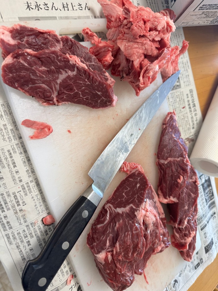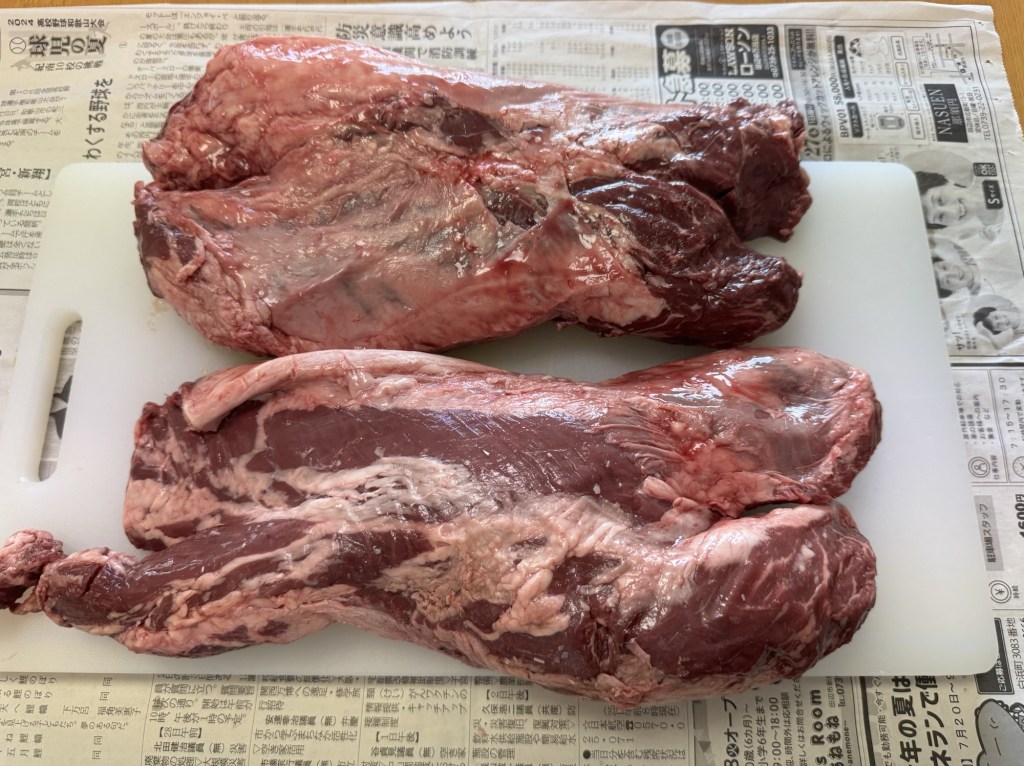 大阪仲間を招いてのBBQパーティーの目玉は、ハラミ。最近は、ハラミにハマっている。アメリカ産のとあるブランド牛をチルドブロックでお取り寄せ。焼肉は、切り方も大事。切り方で硬さ、味は、変わる。BBQの場合は、なるべく大きくカットする。なぜか?それは、言えません。