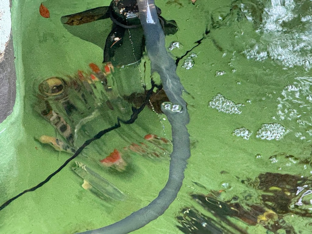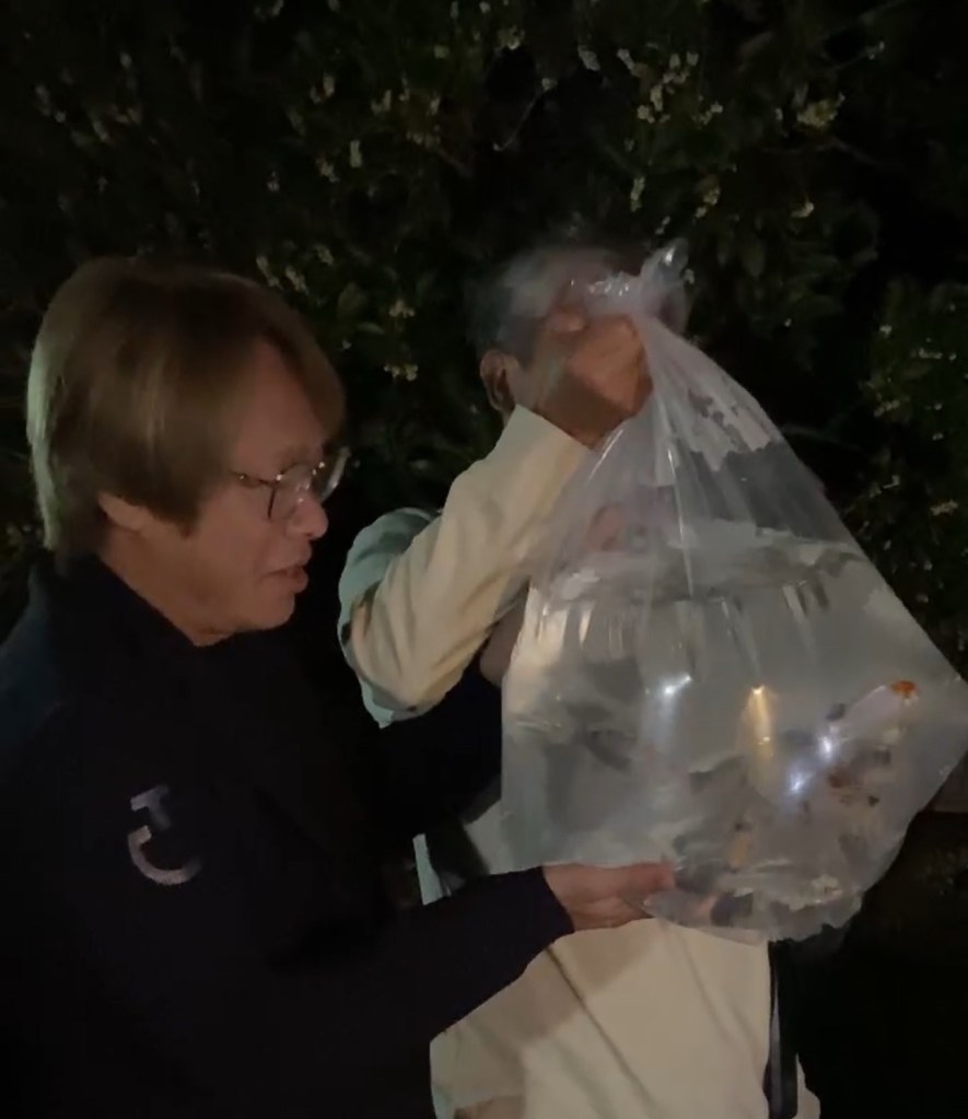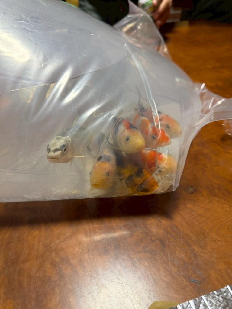 お腹が膨れたあたりで、メインイベントの池への錦鯉の放流。