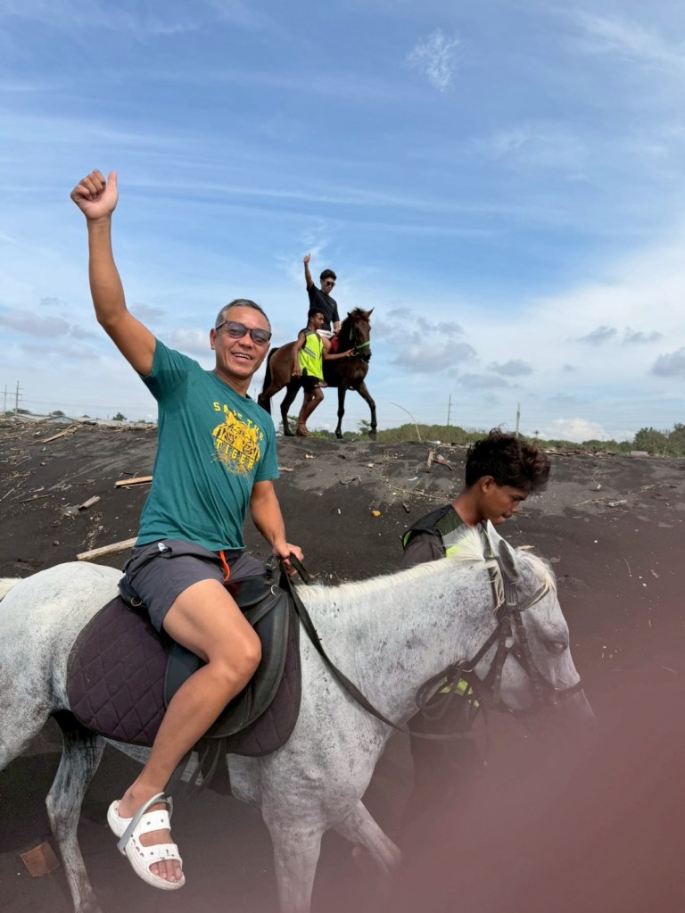 今朝は、8時出発で海岸乗馬からのスタート。馬主のN氏が、乗馬やりたい!の一言で企画。現地の西郷どんがすぐ手配してくれた。砂浜海岸での乗馬は、私も初めてだったが、なかなか最高!