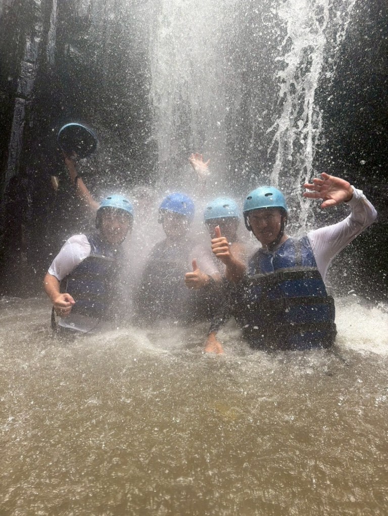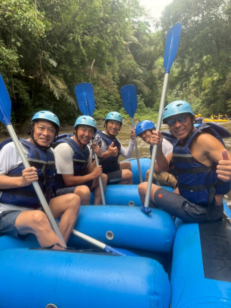 お次は、ウブドのラフティングに挑戦。僕は3回目になるが、N氏とやっさんは、初体験。川まで降りる道が急勾配で結構長い。途中、携帯を持つ珍しいゴリラも現れる。