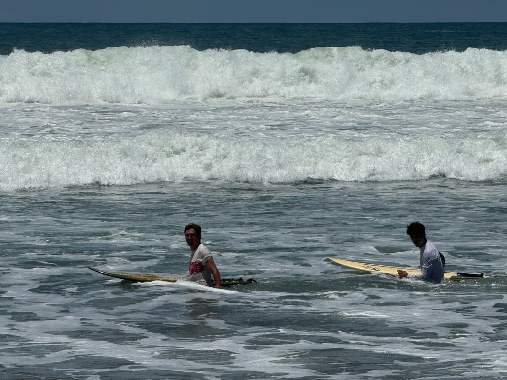 僕は初日のラフティングの川に行き帰りの長〜い階段のフクロハギの筋肉痛と海亀を竜宮城手前まで追いかけすぎて痛めた右耳を理由に2回だけトライ。ちょっと立てそうになると波が切れるの繰り返し。