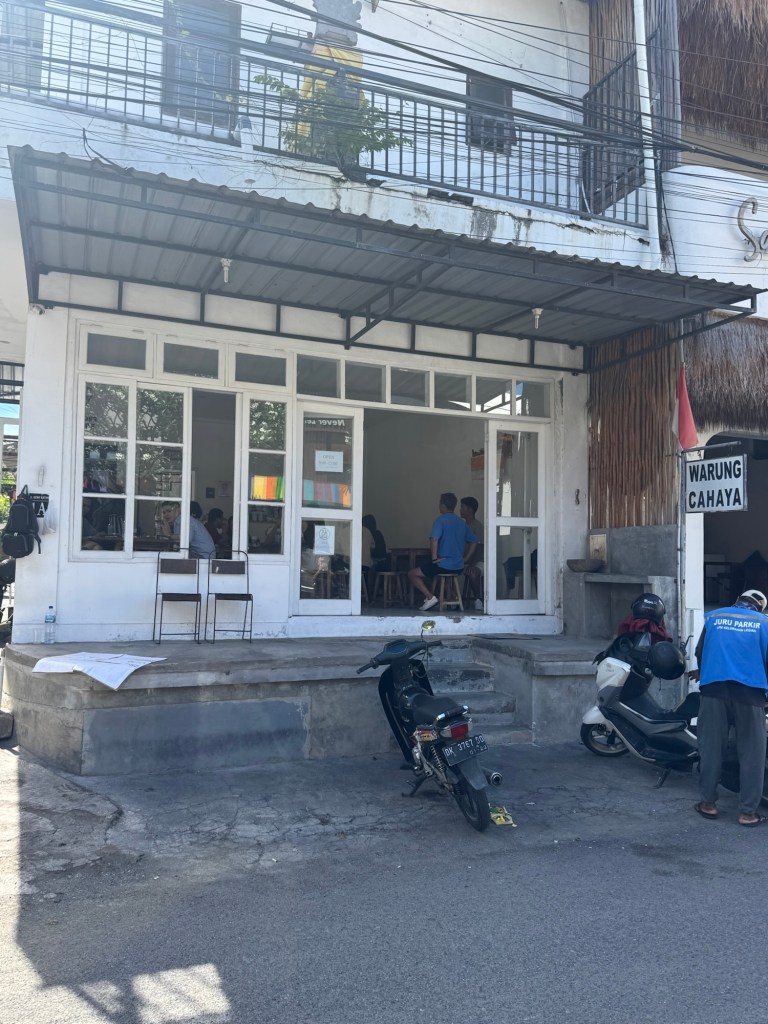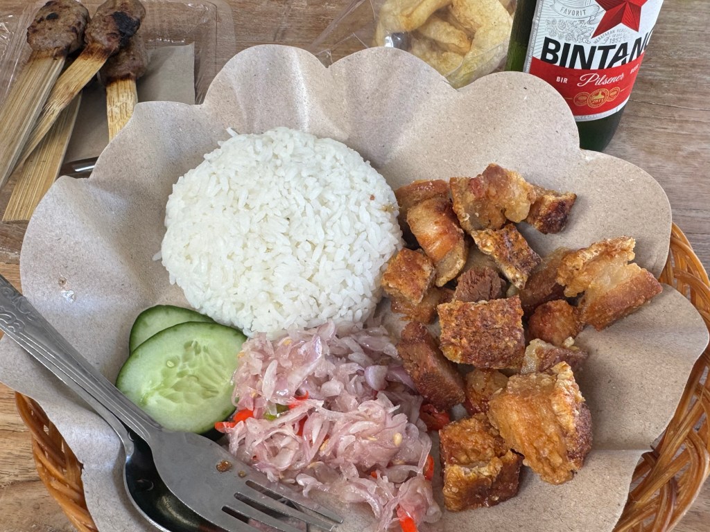 ランチは、毎回1回は行く、この店Cahaya 。ここは、サンバル(辛い薬味)を上手にアレンジして揚げ豚とセットで出すだけのシンプルメニューで流行っているキングオブローカルメシ。