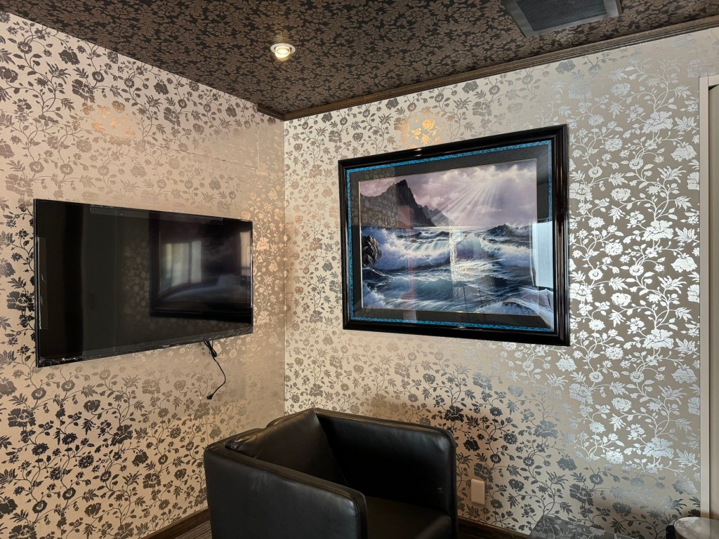 完成してくる設備を点検しながら、いろいろな場所にカーテンレールをつけてゆき、午前は終了。