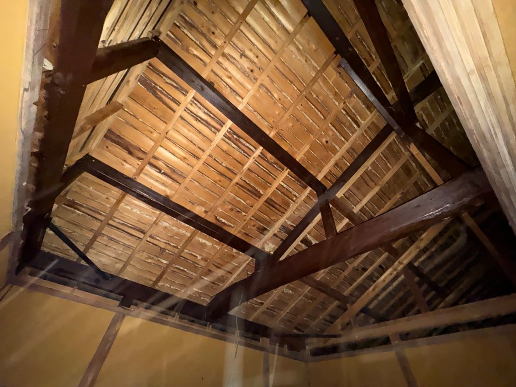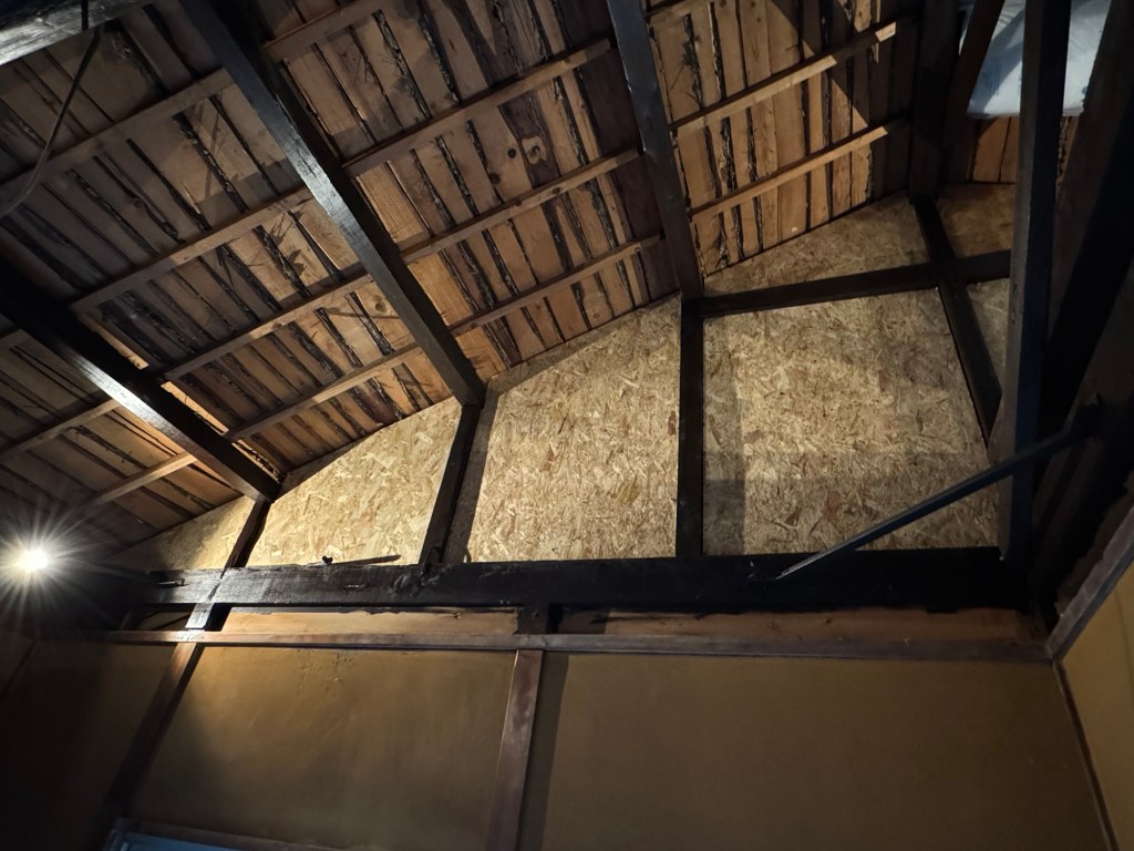 古民家リノベの方は、朝から電気屋さんにきてもらい、電気系統の打ち合わせからのスタートで、天井壁の側面を仕上げた。