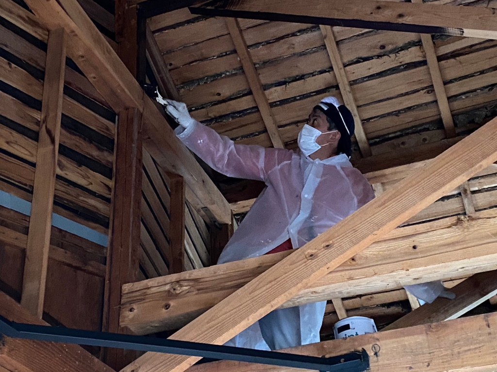 午後は、風乃家に移動して、梁のペンキ塗り塗り。