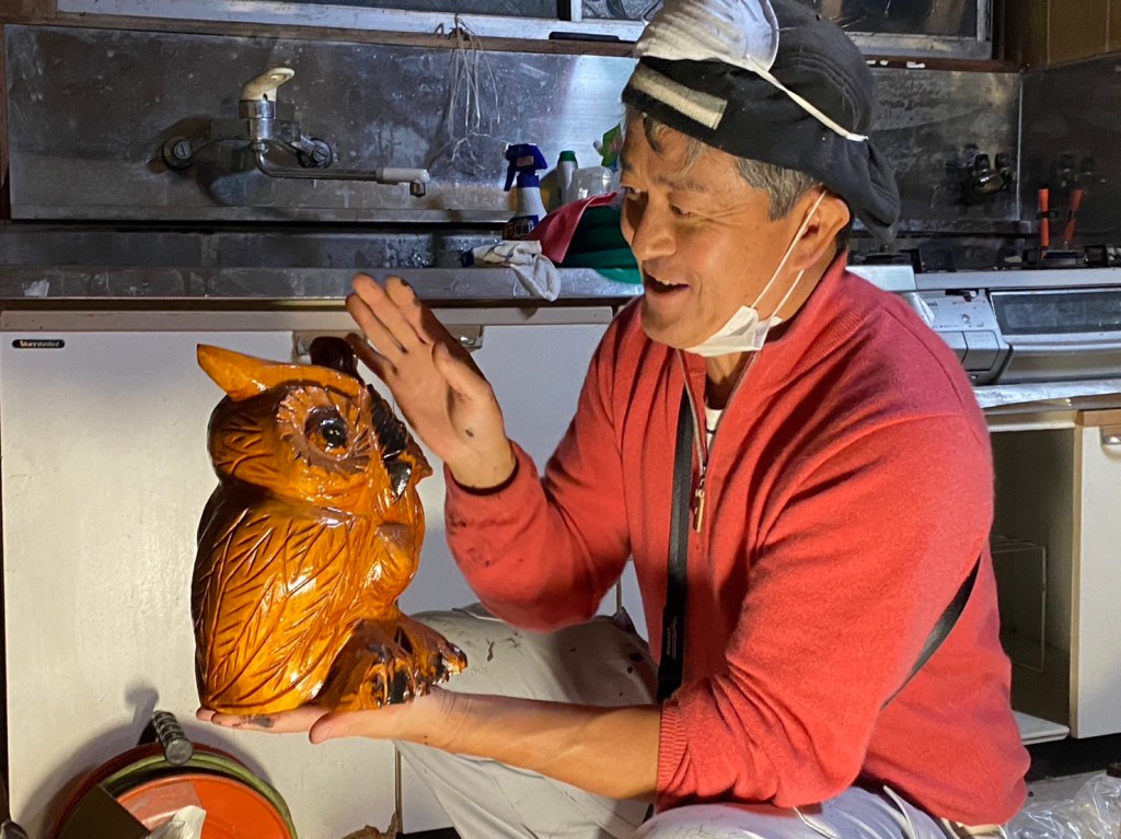 木の真ん中をくり抜いてフクロウの家を作り、中に木彫りのフクロウを入れる。