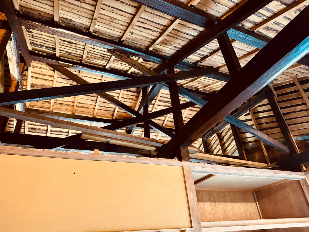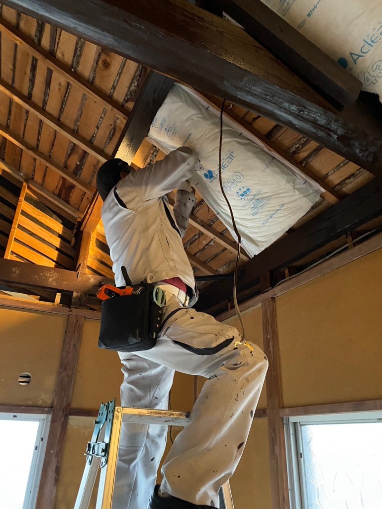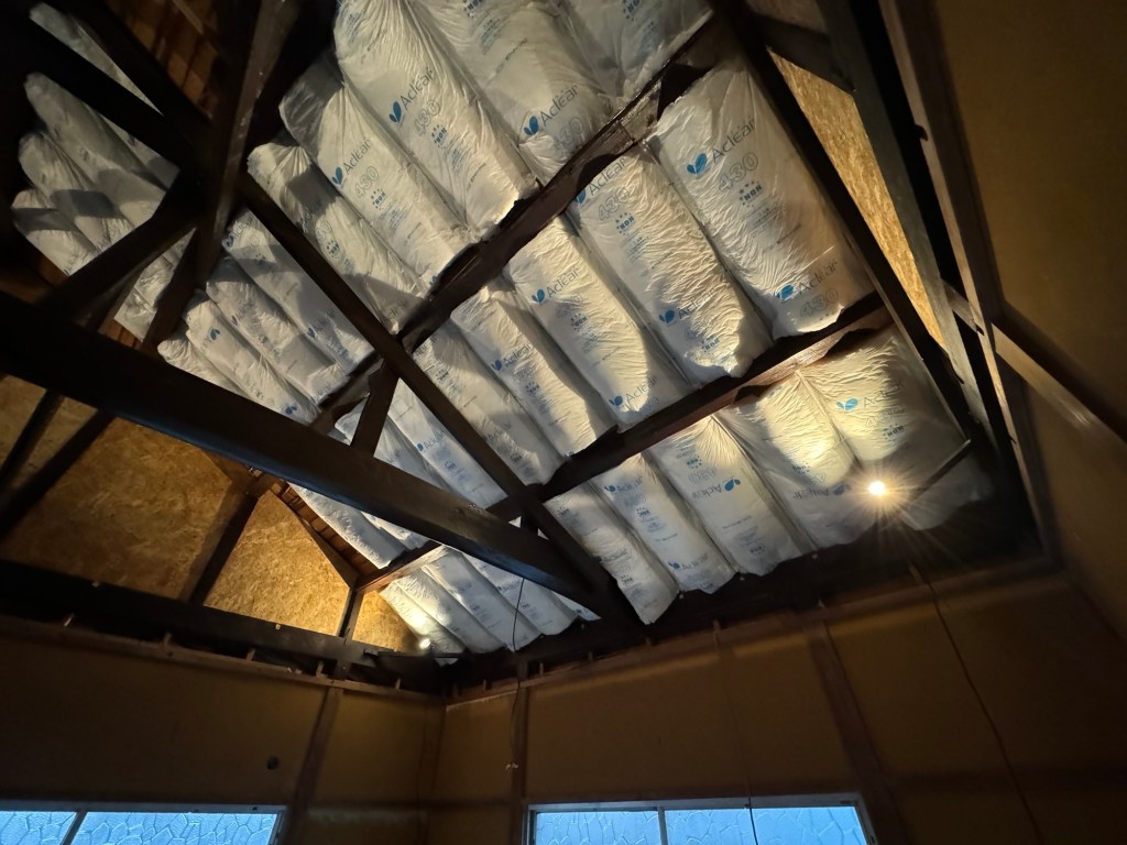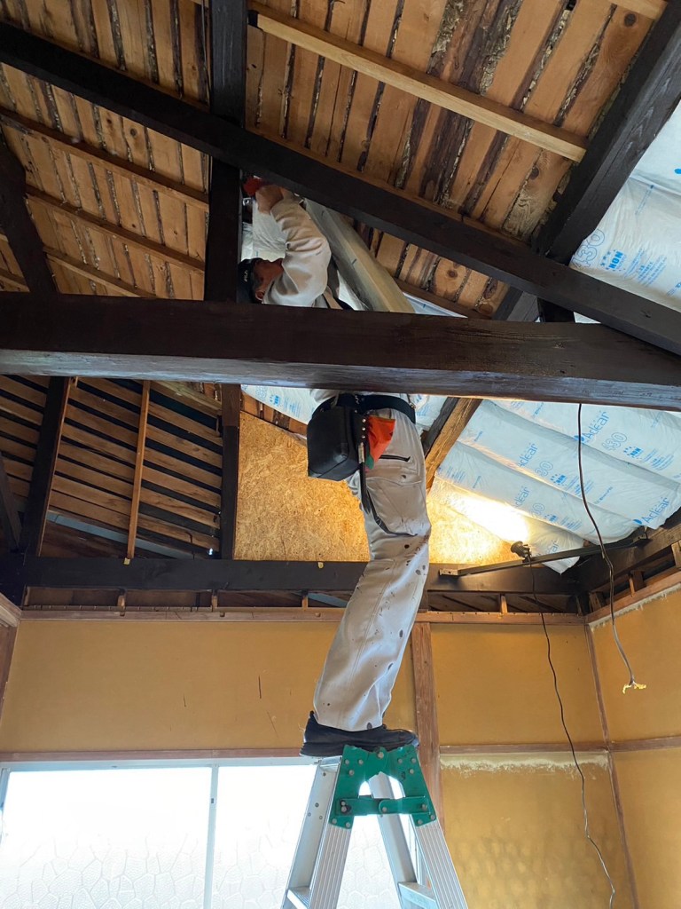 昼からは、いよいよ屋根裏に断熱材を仕込んで天井をつける。ペンキ屋から大工に転身だ!