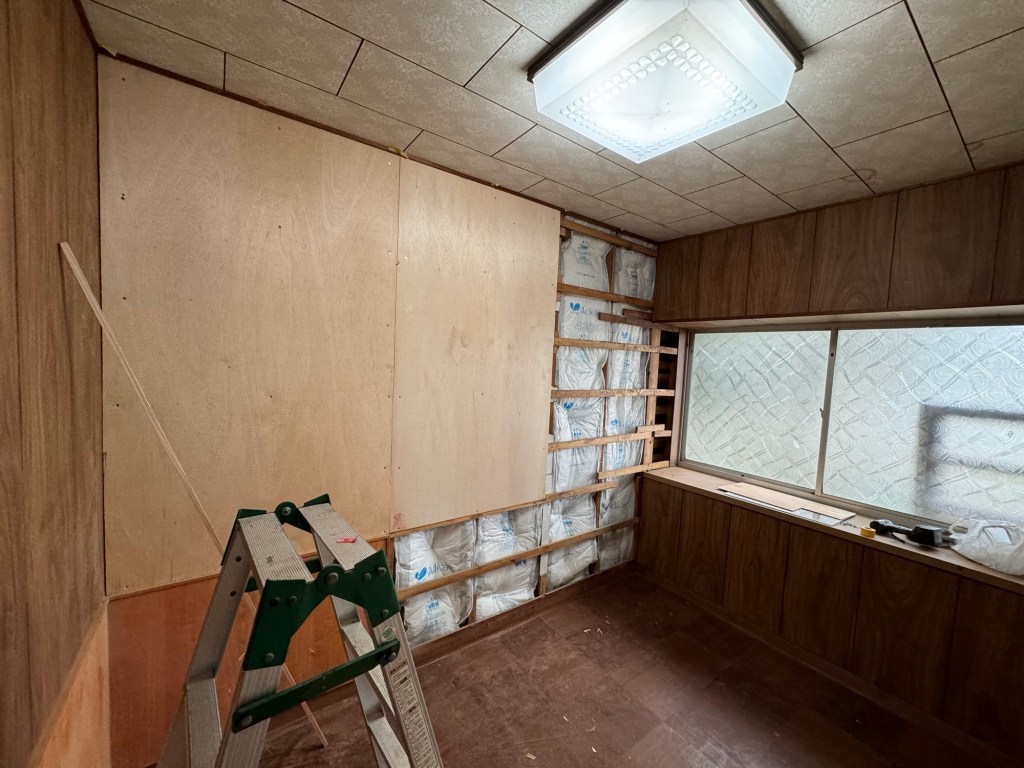 今日は、午前中に個室の腐った壁の補修、断熱材を仕込んで、あとはクロスを貼るだけに