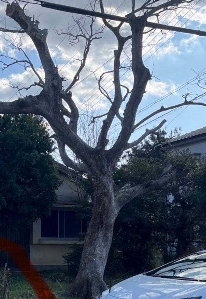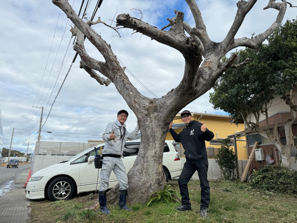 古民家の前に立つ枯れた大木を何かフォトジェニックになるものにしたいといきなりメールをしたら、早速見に来てくれた。
