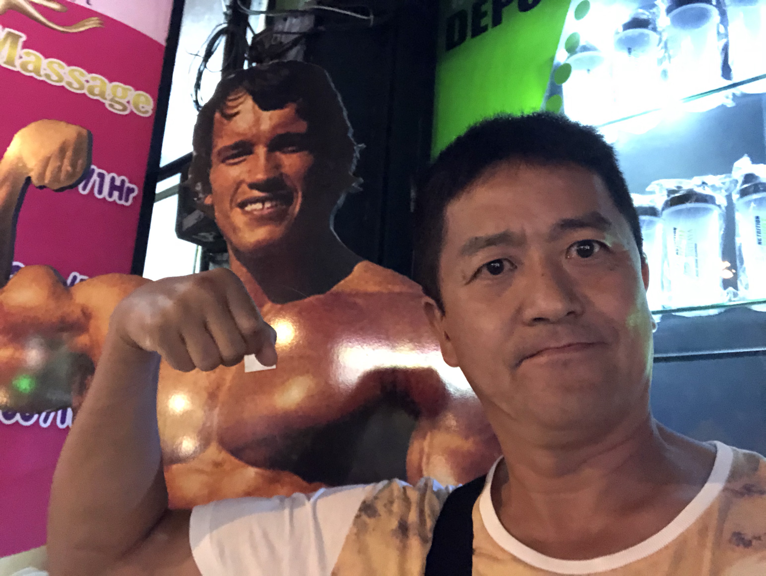 さっぱりして歩いているとアーノルドと出会い2ショット